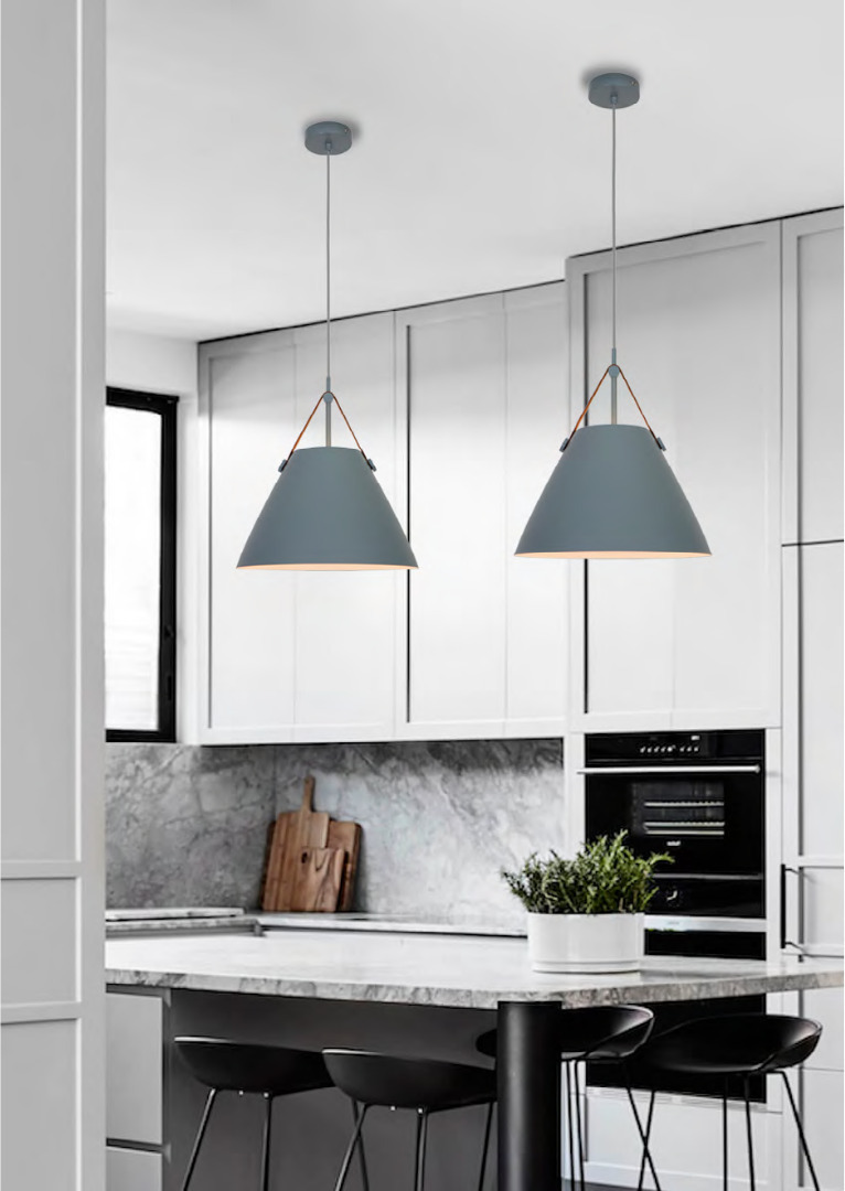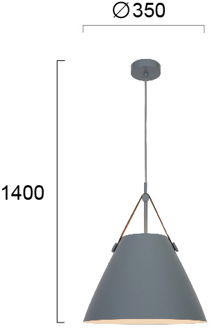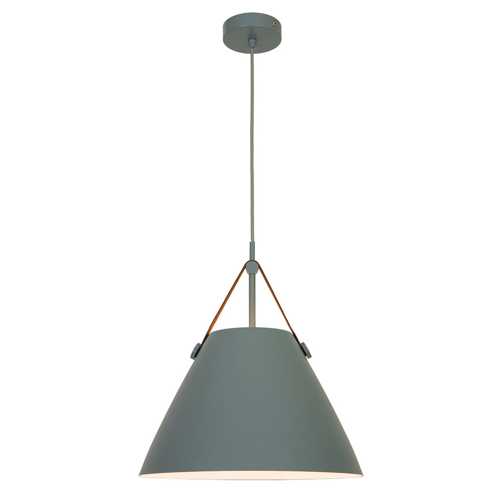 Κρεμαστό μεταλλικό φωτιστικό μονόφωτο σε γκρι χρώμα με λεπτομέρεια δερματίνης καφέ